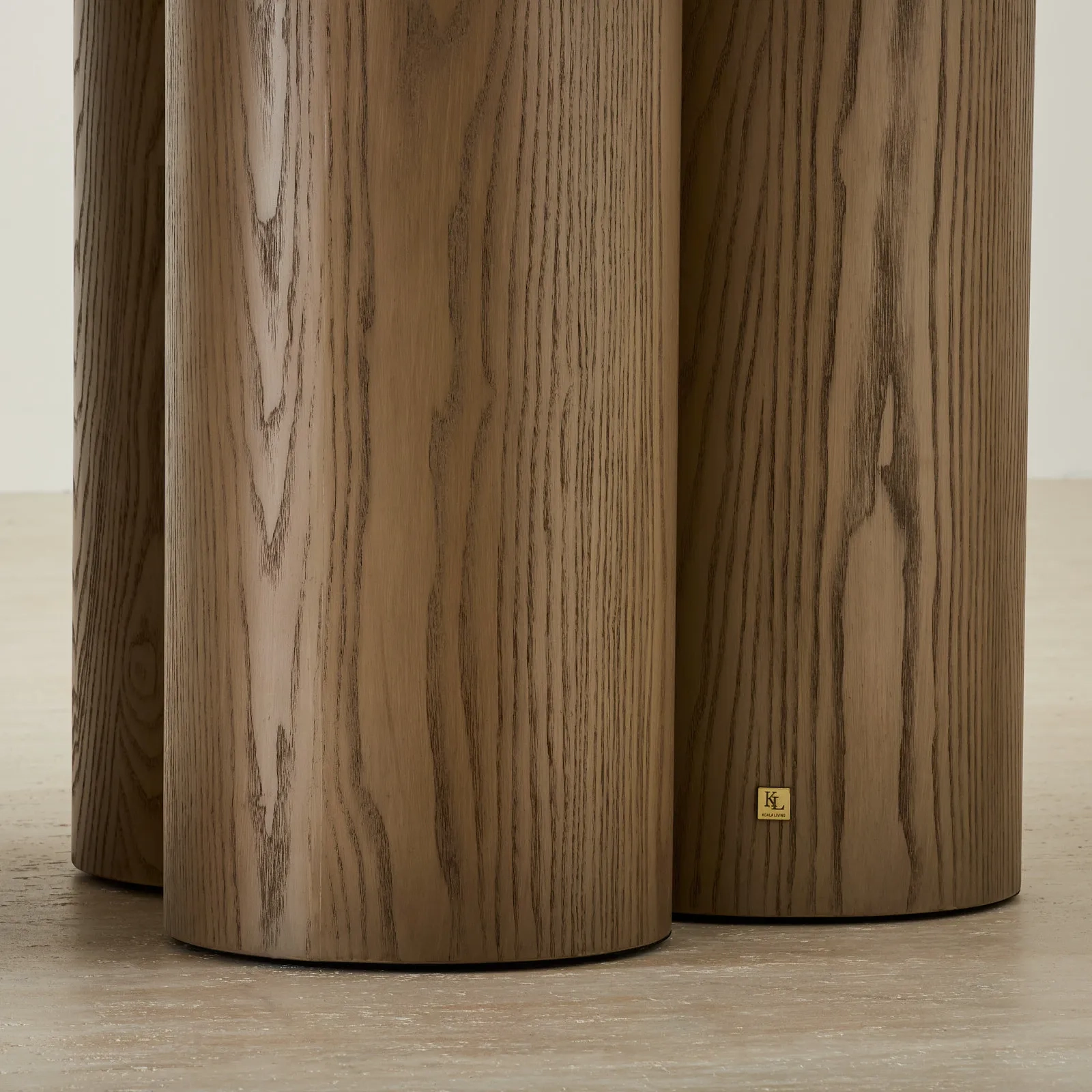 Supported by three solid cylindrical wood columns in a warm medium brown finish, the table combines a contemporary twist with traditional craftsmanship. This sturdy yet stylish foundation ensures stability and balance, making it an inviting centerpiece.