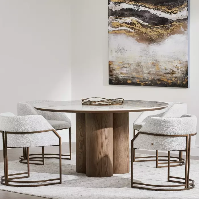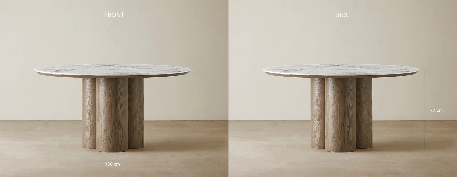The Terzetto Dining Table showcases a blend of modernity and timeless elegance. Its round sintered stone tabletop features luxurious grey and white marbled patterns that bring a sophisticated touch to any dining space.