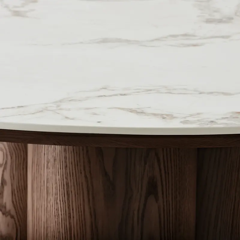 Supported by three solid cylindrical wood columns in a warm Dark Brown Ash finish, the table combines a contemporary twist with traditional craftsmanship. This sturdy yet stylish foundation ensures stability and balance, making it an inviting centerpiece.