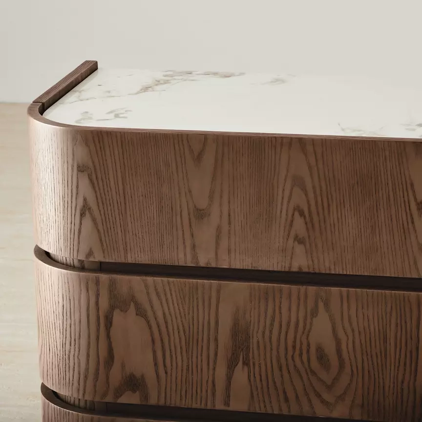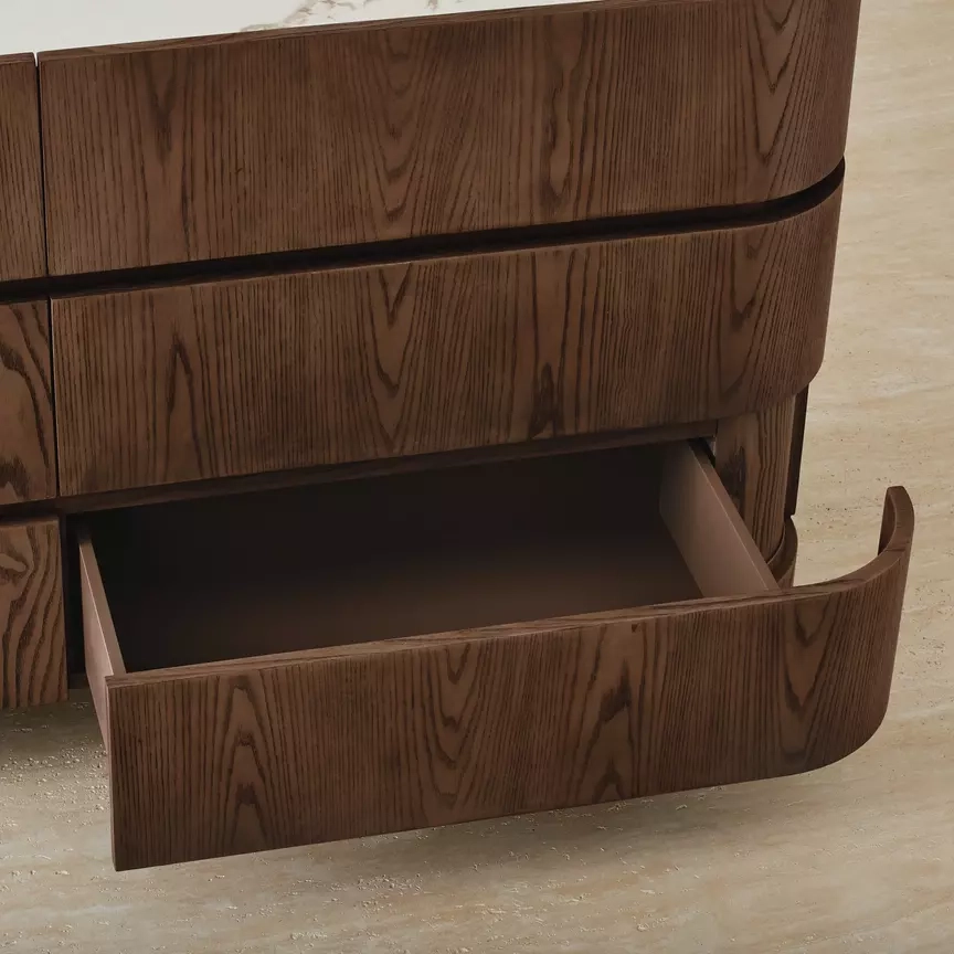 The Terzetto Dresser features a stunning sintered stone top with soft marbled patterns, adding a luxurious touch to your bedroom. It is designed to organize and display your essentials, with its dark brown wood finish adding a warm, natural touch.