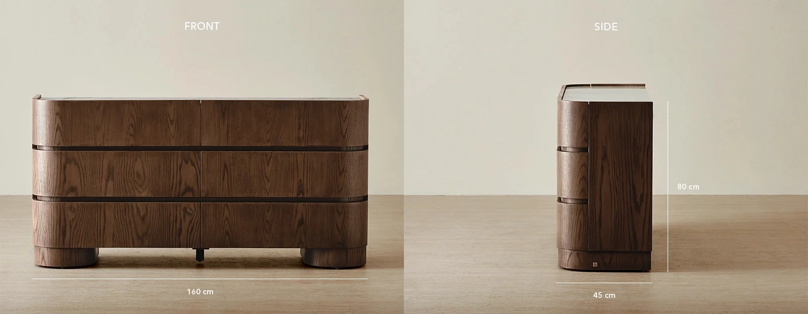 With six spacious drawers, it offers storage for clothing, and other personal items while maintaining a sleek, streamlined appearance. Its refined profile, curved edges, and minimalist design make it a sophisticated and functional centerpiece.