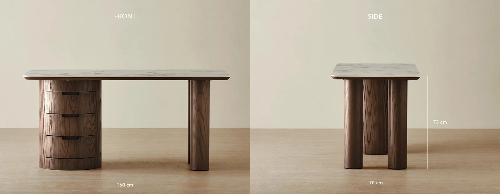 Sintered Stone Luxury The Terzetto Desk blends style and function with a luxurious sintered stone tabletop featuring subtle marbled patterns. Supported by dark-brown cylindrical wood columns, it adds natural warmth and modern elegance to any space.