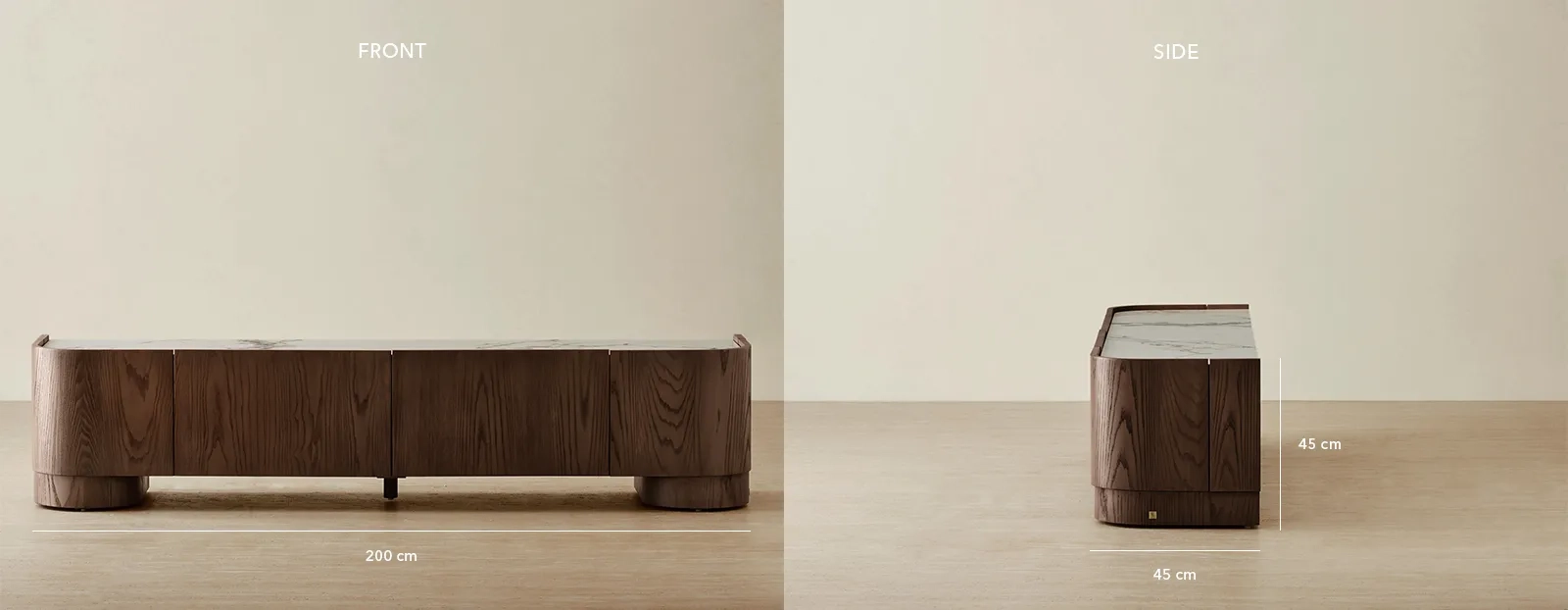 The unit’s spacious storage options keep your media essentials neatly organized while enhancing the room’s aesthetics. Its refined profile and curved edges make it a stylish addition, perfectly balancing function and elegance.