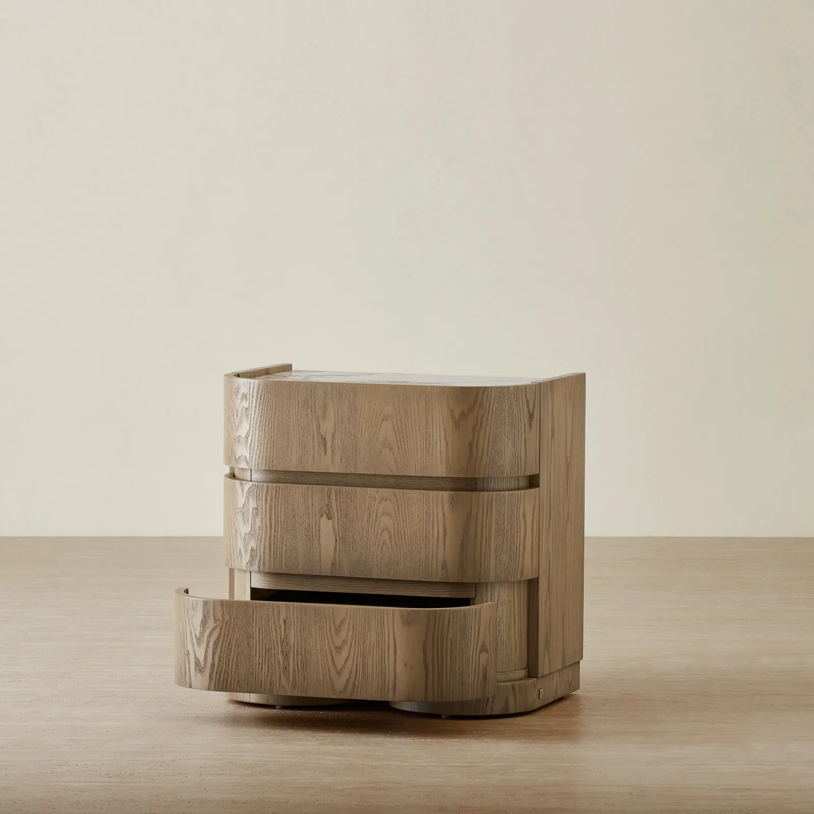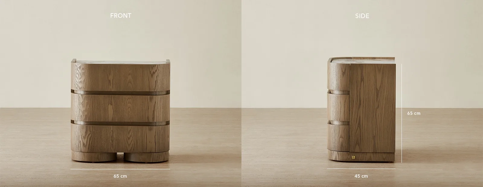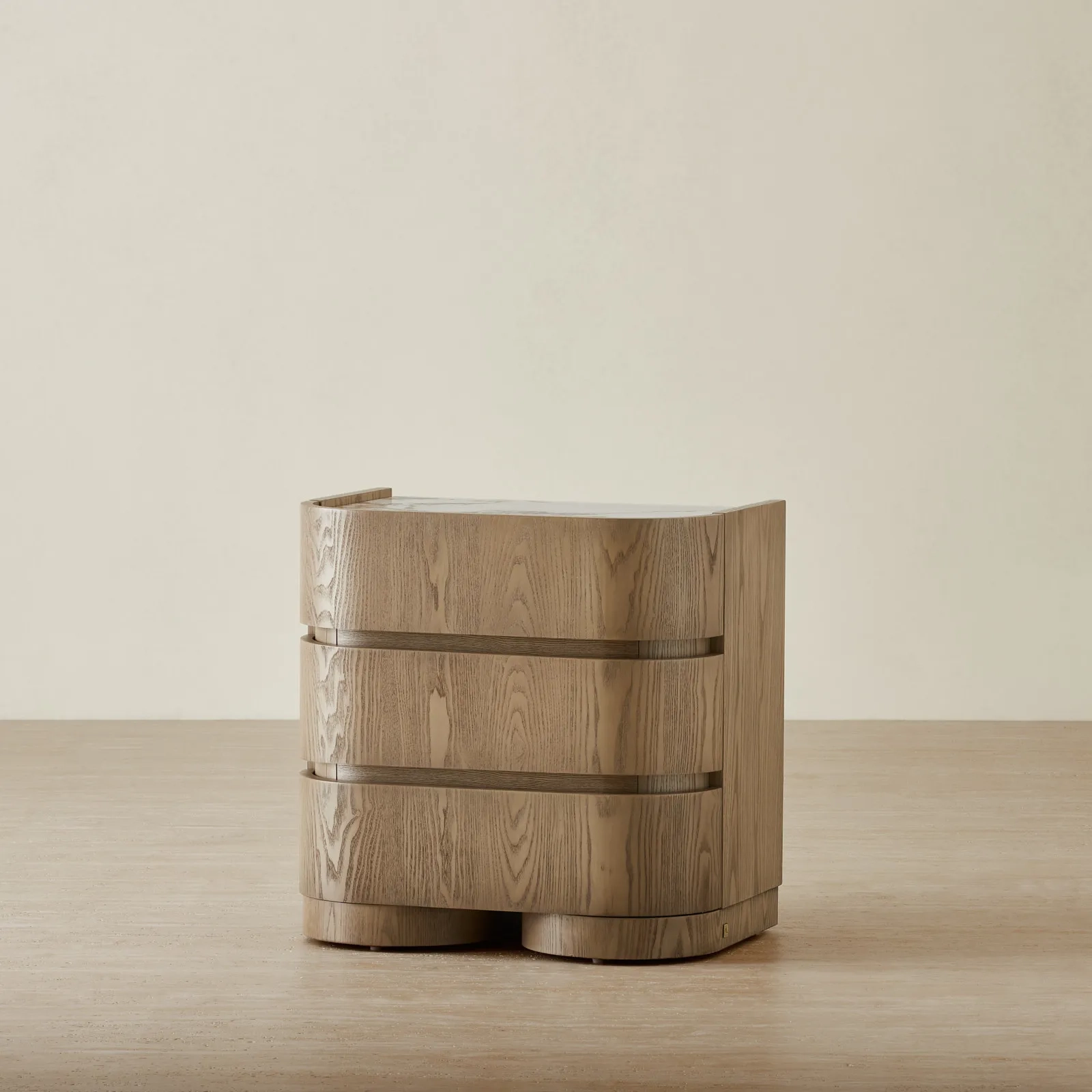 Three spacious drawers provide ample storage, blending practicality with sophisticated design. Its curved profile and smooth finish make it a standout piece beside any bed.