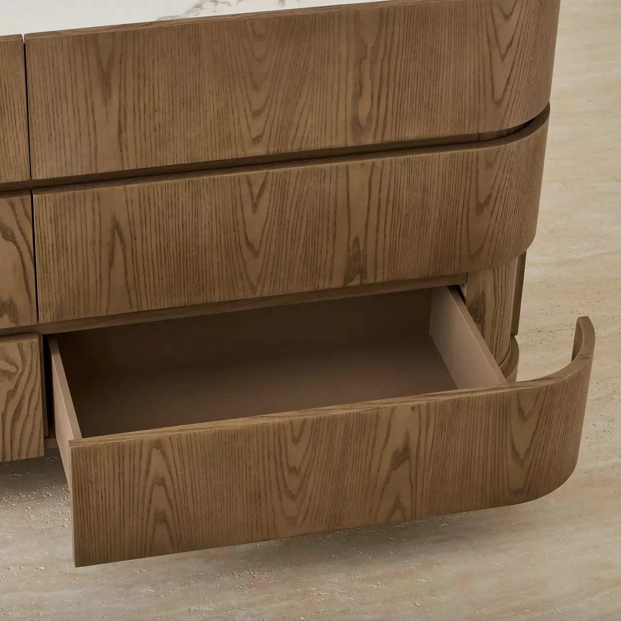The Terzetto Dresser features a stunning sintered stone top with soft marbled patterns, adding a luxurious touch to your bedroom. It is designed to organize and display your essentials, with its medium brown wood finish adding a warm, natural touch.