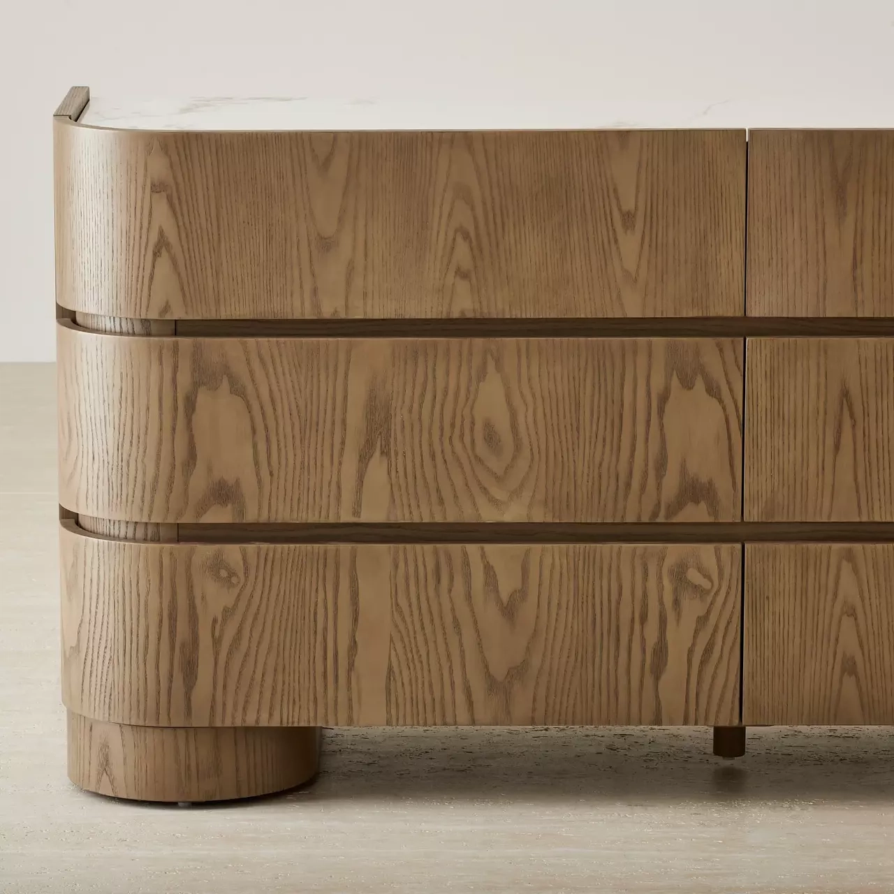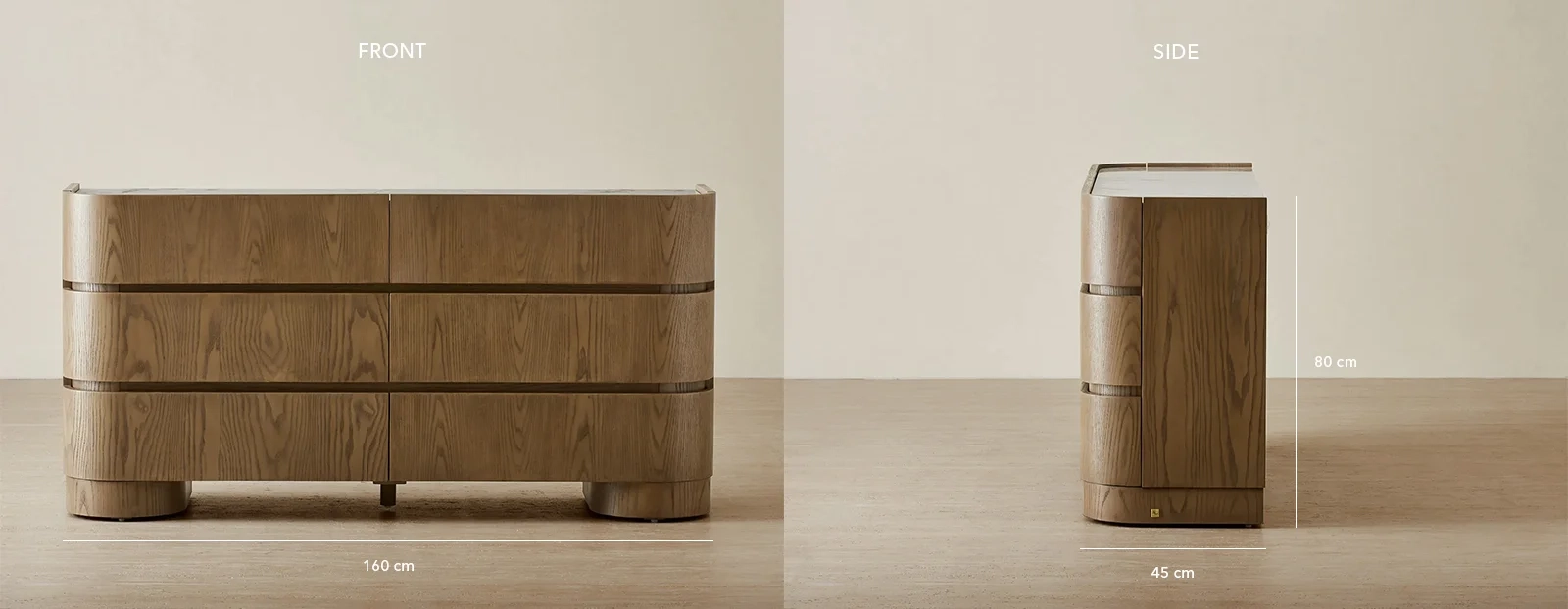 With six spacious drawers, it offers storage for clothing, and other personal items while maintaining a sleek, streamlined appearance. Its refined profile, curved edges, and minimalist design make it a sophisticated and functional centerpiece.