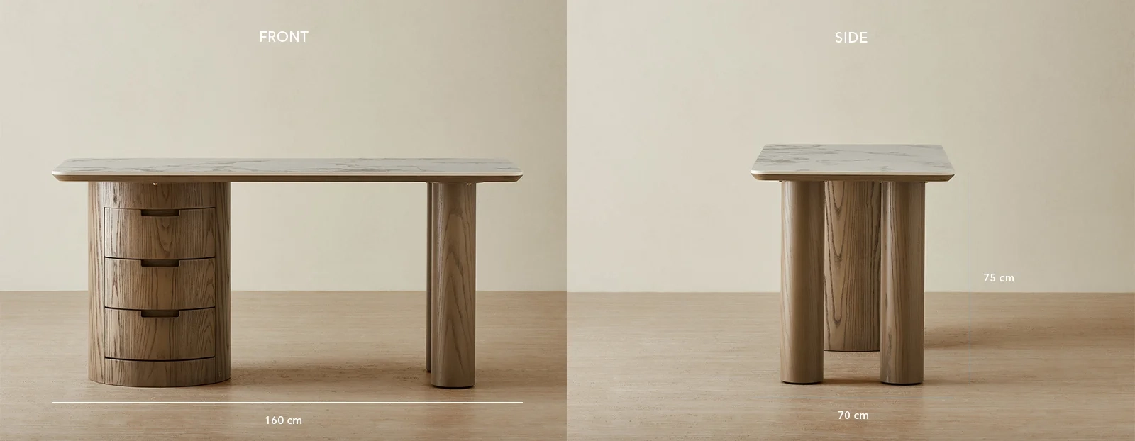 The Terzetto Desk blends style and function with a luxurious sintered stone tabletop featuring subtle marbled patterns. Supported by medium-brown cylindrical wood columns, it adds natural warmth and modern elegance to any space.