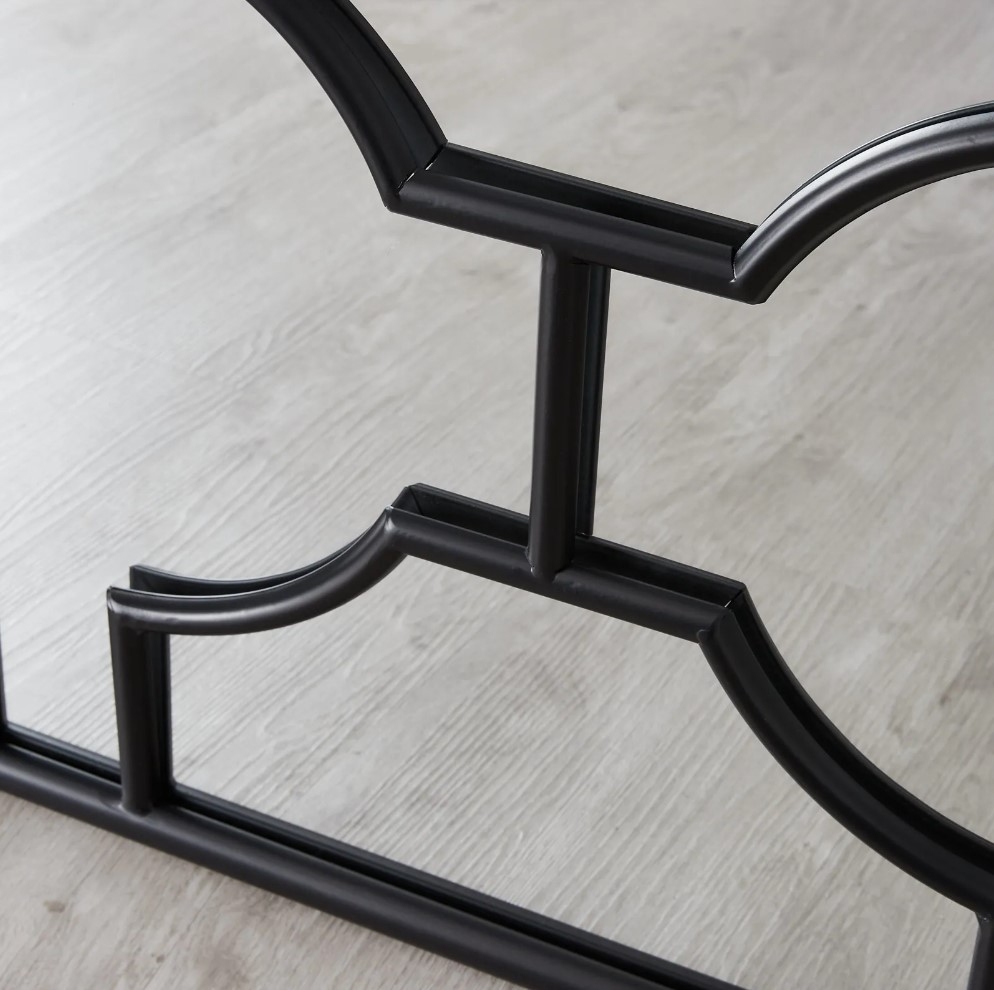 Evoking a sense of timeless elegance, the Tessellated Mirror seamlessly marries classical art deco inspiration with modern craftsmanship. At its heart lies a pristine square mirror, gracefully enveloped by a sleek black metal frame. The frame's intricate pattern, defined by striking lines and sweeping curves, acts as both a protective barrier and an artistic statement.