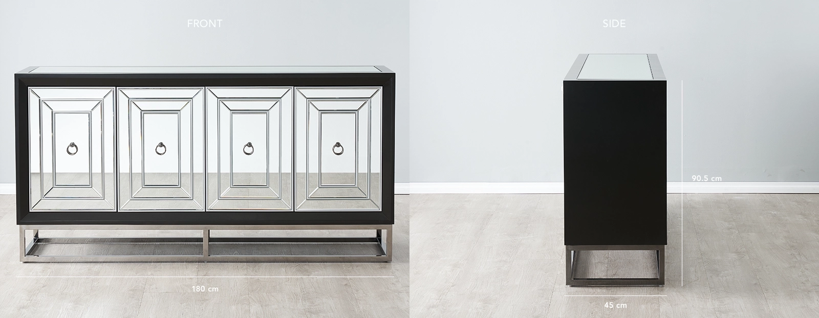 Reflect your living room in a new light with the exquisite Thalia Sideboard. This majestic piece makes for a fine addition to any living room with its exquisite, mirrored panels and striking stand-out design. Your prized cutlery, beautiful decorations and more will look terrific as it rests upon its dashing colours and finely crafted frame. This frame is made from high-quality wood draped in a sleek dark shade.