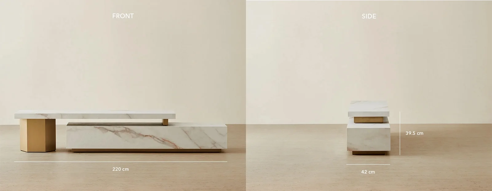 The Thames Collection, designed by the talented Bianca Armenion, seamlessly combines elements of nature and luxury. Each piece showcases a pristine surface made from Calcatta White sintered stone, with intricate grey veins, enhancing the stone's natural beauty and echoing the grandeur of ancient monoliths. The golden stainless steel legs, with their luxurious sheen, add a touch of opulence and warmth to any room, serving as elegant statements rather than mere supports. Bianca's meticulous attention to detail is evident in every aspect of the Thames Collection, resulting in functional works of art that elevate any space with refined sophistication and style.