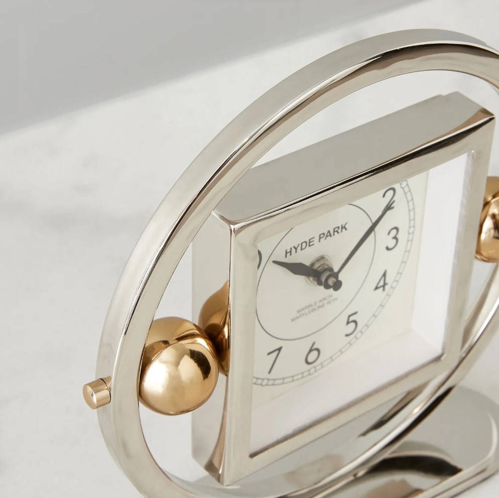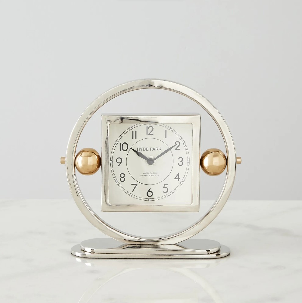 But what truly sets the Tiffany apart is its unique structure: cradled within a circular steel frame, the clock seems to float, held in place by two gleaming brass spheres on either side. These spheres not only serve a functional purpose but also add a touch of ornate beauty, creating a balance between the matte finish of the nickel and the warm glow of the brass.