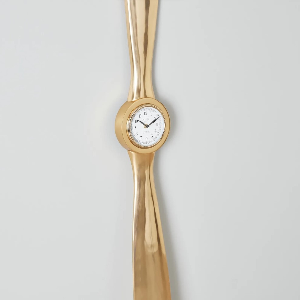 Infusing timeless elegance with a hint of nostalgia, the Time Keeper Clock stands out as a testament to exquisite craftsmanship. At its heart, a pristine white face tells tales of passing moments, enveloped by an intricate propeller-inspired design bathed in the warm glow of antique brass.