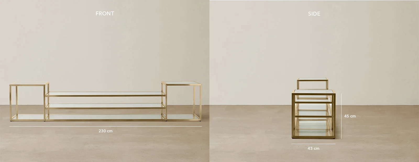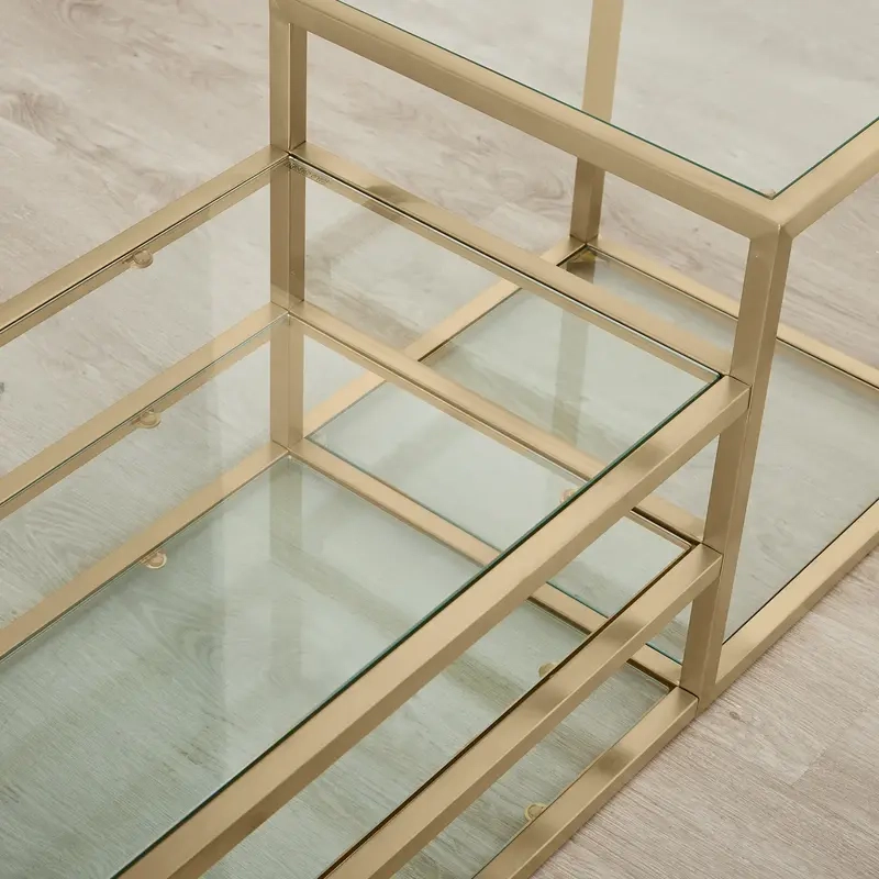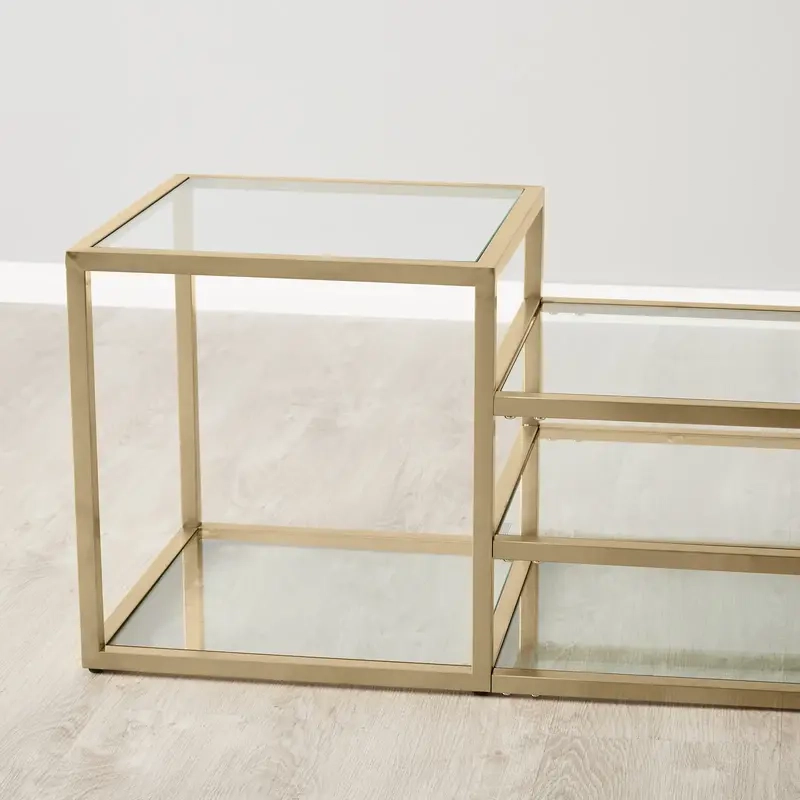 The Tinsley Entertainment Unit features a slender frame and open design, bringing modern elegance to any space. Crafted from high-quality stainless steel in a brushed champagne gold finish, it offers a refined look with lasting durability.