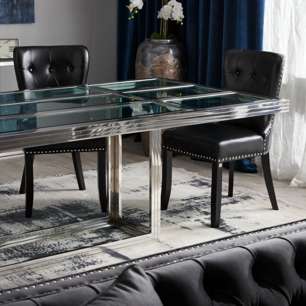 Elevate your dining experience with the captivating Titus Stainless Steel Dining Table. This modern masterpiece seamlessly blends style and functionality, making it a focal point in any dining space. The spacious tabletop, comprised of nine individual panes of glass, creates a stunning visual effect that adds a touch of sophistication to your gatherings. The glass is elegantly tinted in a smoky green shade, adding a unique and contemporary element to the design.