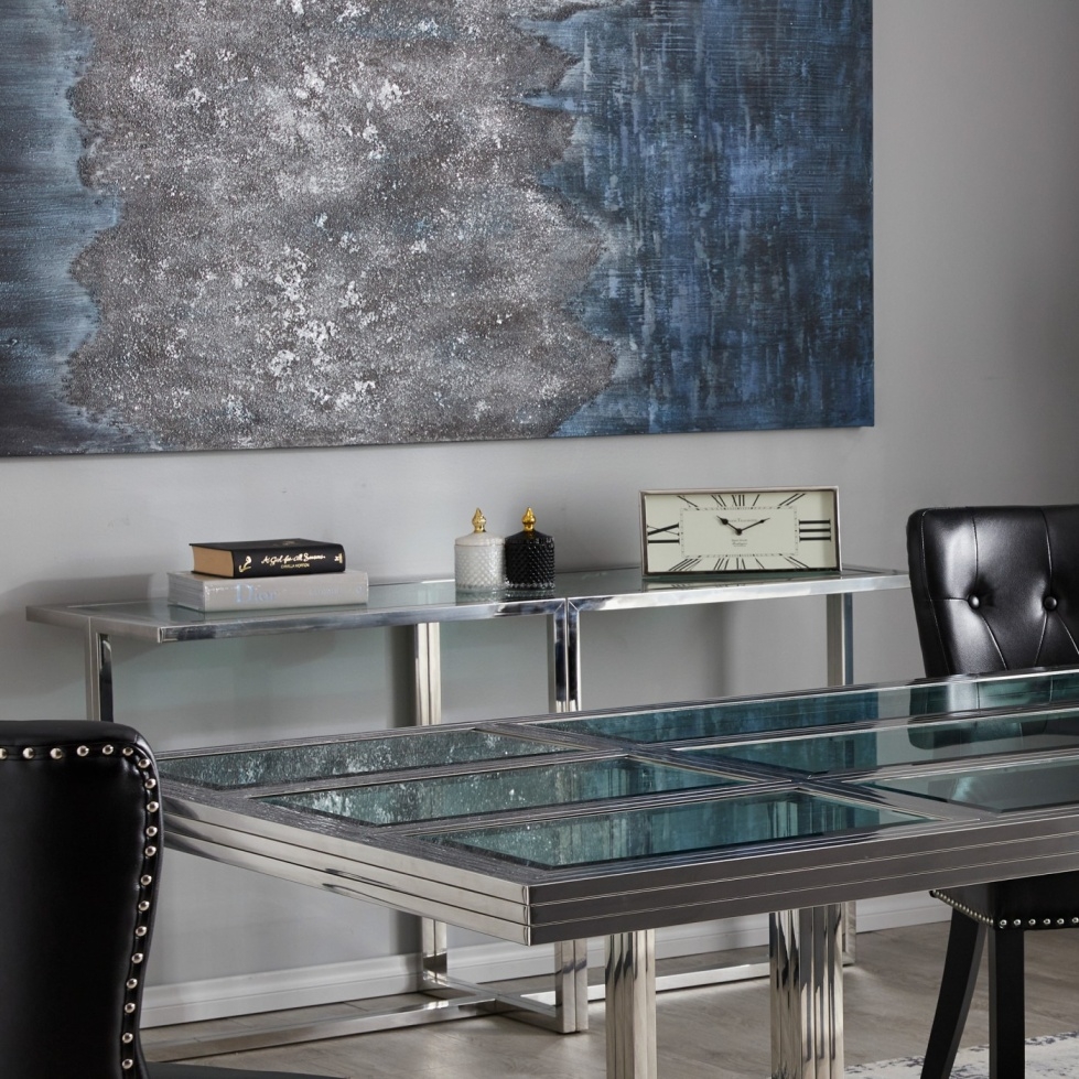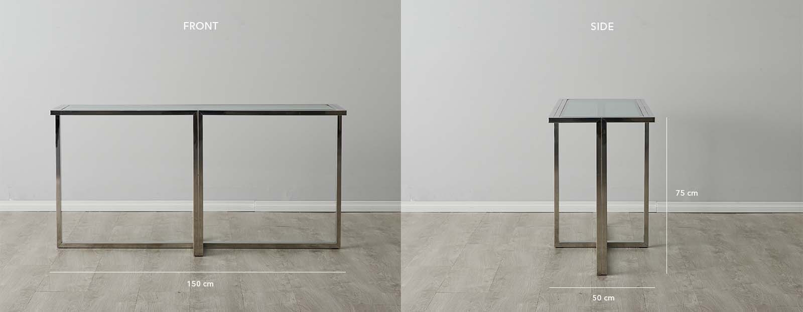 The Titus Stainless Steel Console Table adds a luxurious flair to your home with its modern design and stunning colours. Be mesmerized by the Titus' gorgeous, tinted glass tabletop that features a smoky green coloured shade. Its spacious surface can serve as a worthy pedestal for your favourite decorations and prized keepsakes.