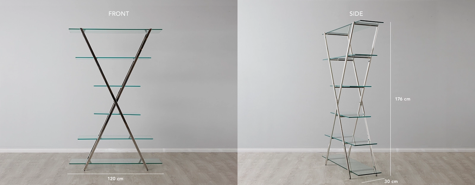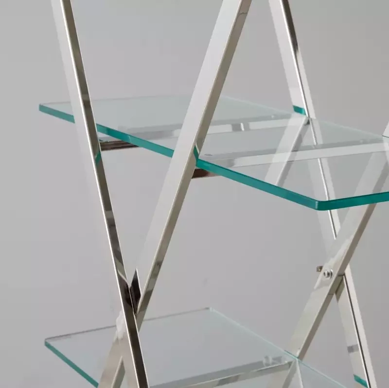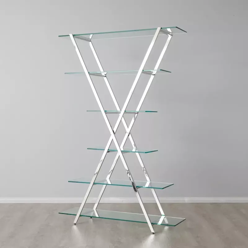 Its cross-shaped frame and varying shelf lengths create a striking, multi-tiered design, with the gleaming metallic finish contrasting beautifully against the clear tempered glass.