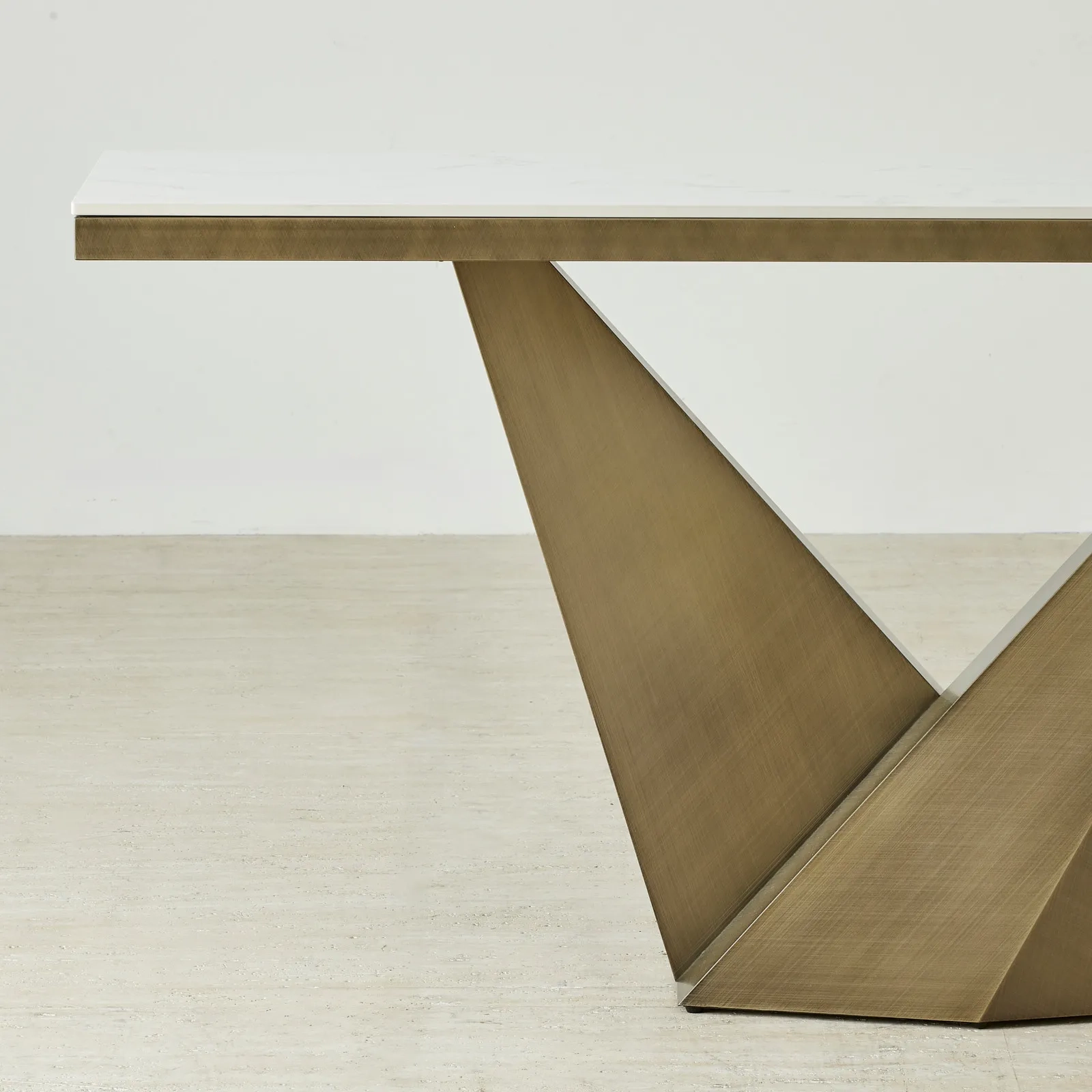 Supported by a striking brushed bronze base with sharp geometric lines, it delivers a bold architectural statement. With refined finishes and a commanding silhouette, Vania brings quiet luxury and structure to any hallway or living space.