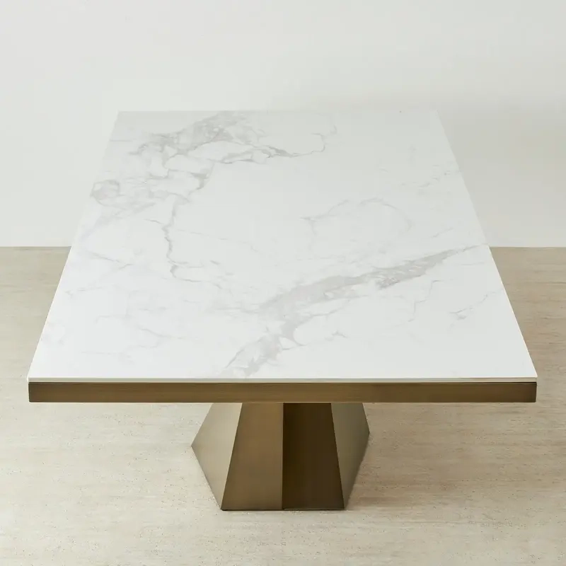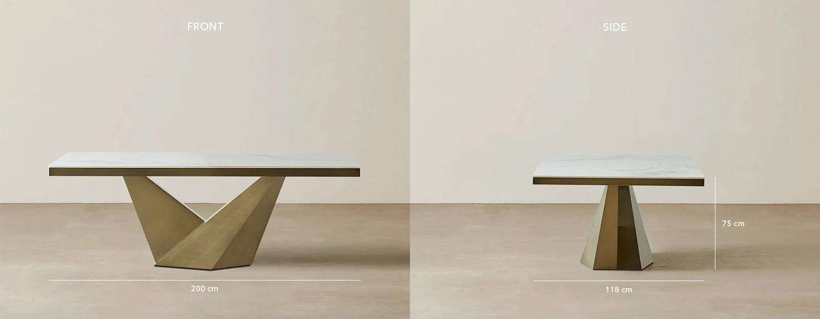 Set on a bold brushed bronze base with sharp geometric lines, Vania creates a striking architectural presence. With its refined finishes and confident silhouette, this table adds quiet luxury to any modern dining space.