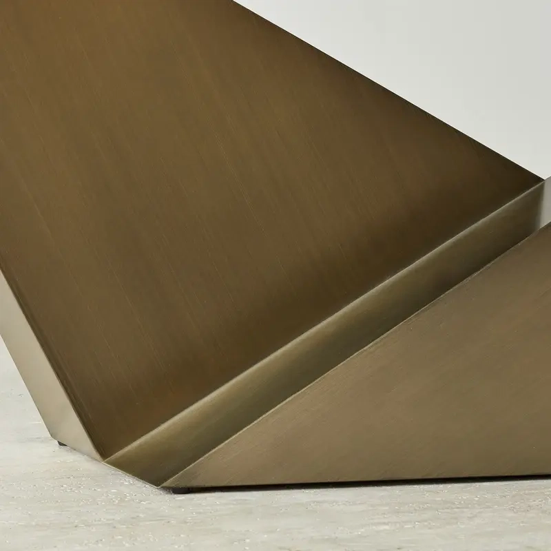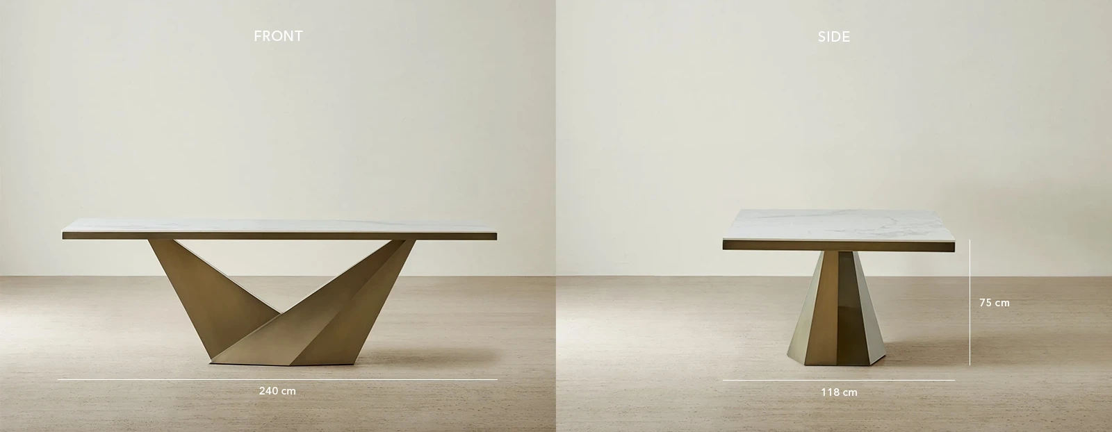 Set on a bold brushed bronze base with sharp geometric lines, Vania creates a striking architectural presence. With its refined finishes and confident silhouette, this table adds quiet luxury to any modern dining space.