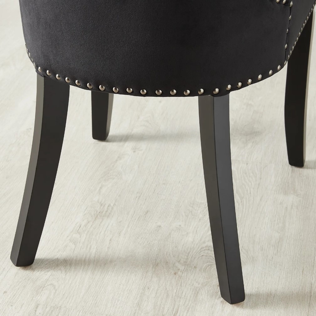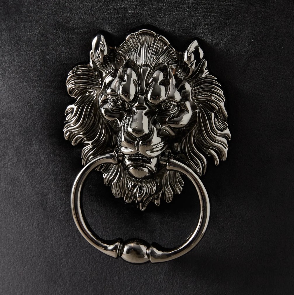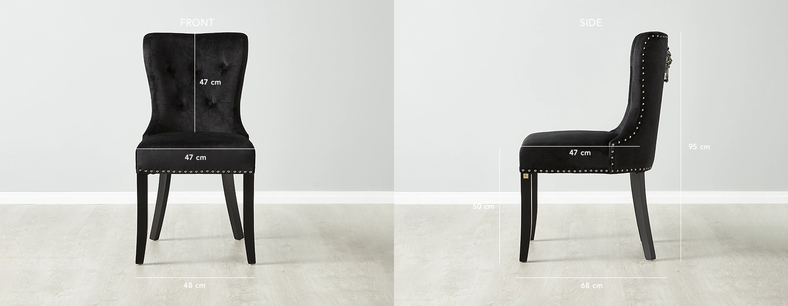 The frame is then expertly upholstered with luxe black-coloured velvet, adding a layer of opulence and sophistication. The silver studs that run along the outline of the chair serve as exquisite embellishments, enhancing the overall aesthetic and adding a touch of glamour. The button-tufted backrest of the Viktor Dining Chair adds a plush and distinct look, exuding elegance and refinement. To further enhance its luxurious aesthetic, the Viktor features an ornamental pull ring with an exquisite lion head design.