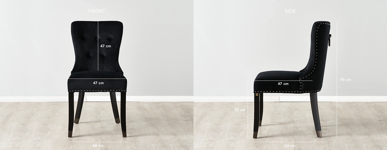The frame is then expertly upholstered with luxe Black velvet fabric, adding a layer of opulence and sophistication. The silver studs that run along the outline of the chair serve as exquisite embellishments, enhancing the overall aesthetic and adding a touch of glamour. The button-tufted backrest of the Viktor Dining Chair adds a plush and distinct look, exuding elegance and refinement. To further enhance its luxurious aesthetic, the Viktor features an ornamental pull ring.