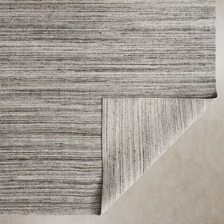 The Vincenzo Ivory Charcoal Floor Rug showcases a refined horizontal linear design, creating a sophisticated, textured stripe pattern.