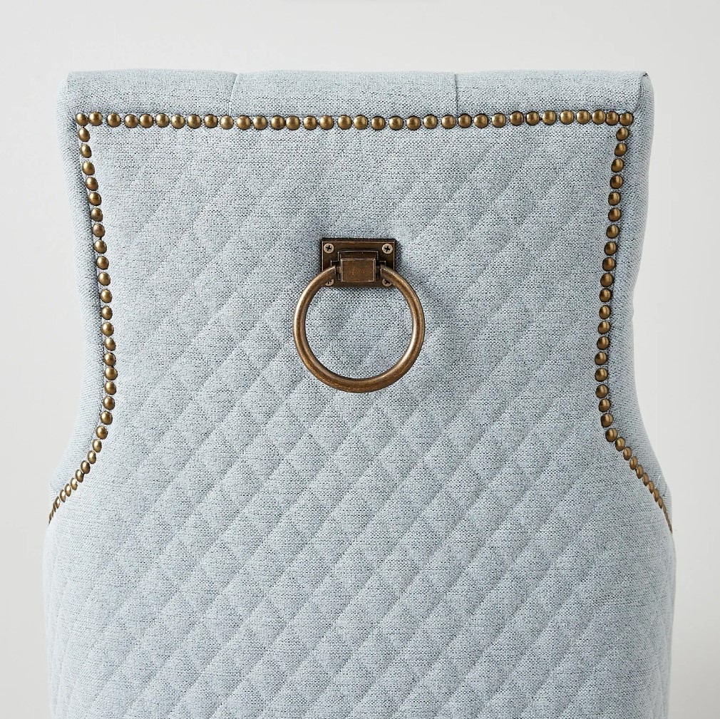 Accentuating the chair's silhouette is the row of brass-coloured studs, which outlines the contours of the chair with precision and adds a touch of opulence. This intricate detailing adds depth and character to the Vivienne Dining Chair, elevating its formal look and creating a sense of refinement. The sleek black legs further contribute to the chair's elegance, providing a sturdy and durable foundation. The sharp contrast of the legs with the serene tone of the upholstery creates a harmonious and balanced visual composition. A decorative pull ring graces the back of the chair, introducing an element of vintage charm and functionality.