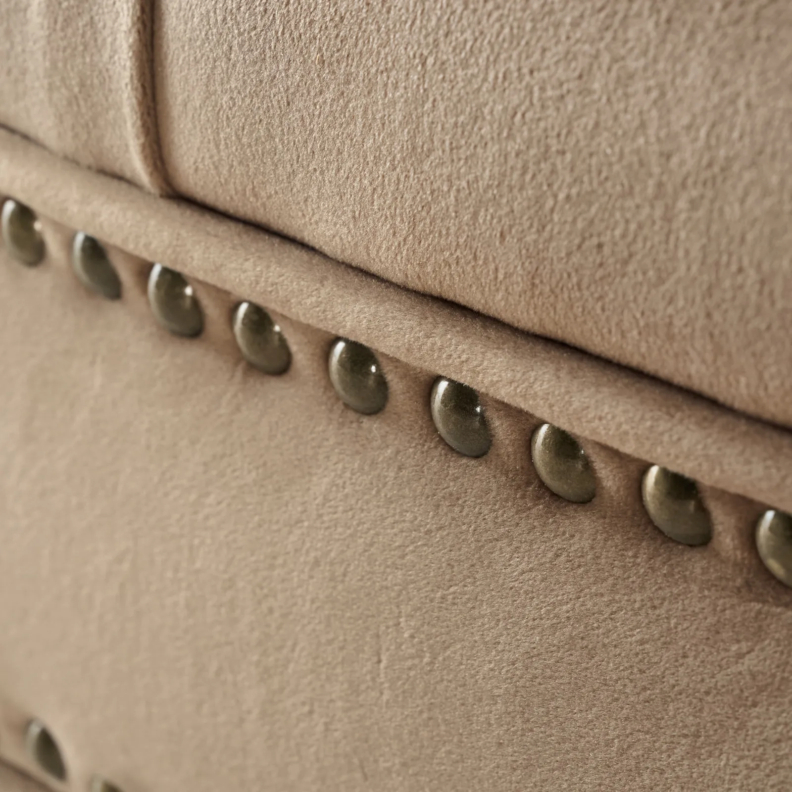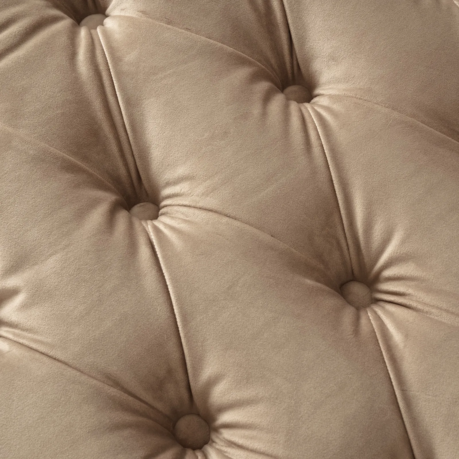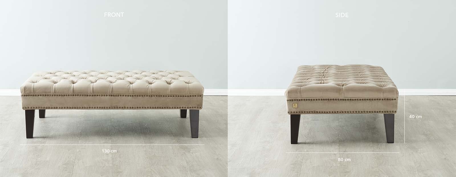 The Vogue Beige Velvet Ottoman offers a look of timeless elegance to your home with its classical form in a sophisticated shade of beige. The Vogue Ottoman is made from premium quality pine wood crafted into a fine rectangular frame, draped in a luxurious offering of velvet fabric. The seat is button tufted to perfection in keeping with the classical look as well as comfort. Brass-coloured studs cap off the Vogue Ottoman, as two rows run along its outline, further adding to its glamour.