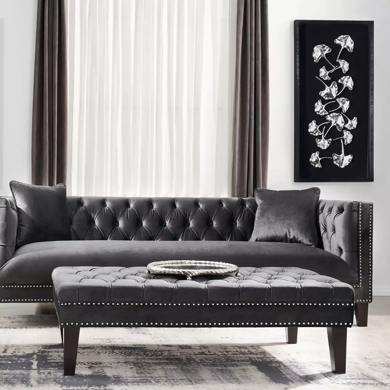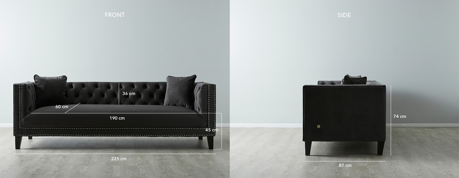 The Vogue 3-Seater Sofa draws inspiration from classic tuxedo and art-deco designs, featuring clean lines and geometric shapes that capture the essence of art deco style. Its frame is upholstered in charcoal velvet, adding a dapper, regal appearance.
