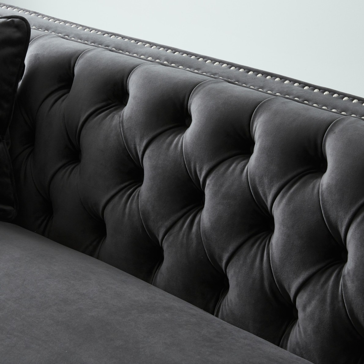 The backrest features hand-tufted velvet in a diamond pattern, adding luxury and extra cushioning. Two rows of coloured studs run along the backrests, armrests, and lower frame, enhancing the Vogue 3-Seater's glamorous look.