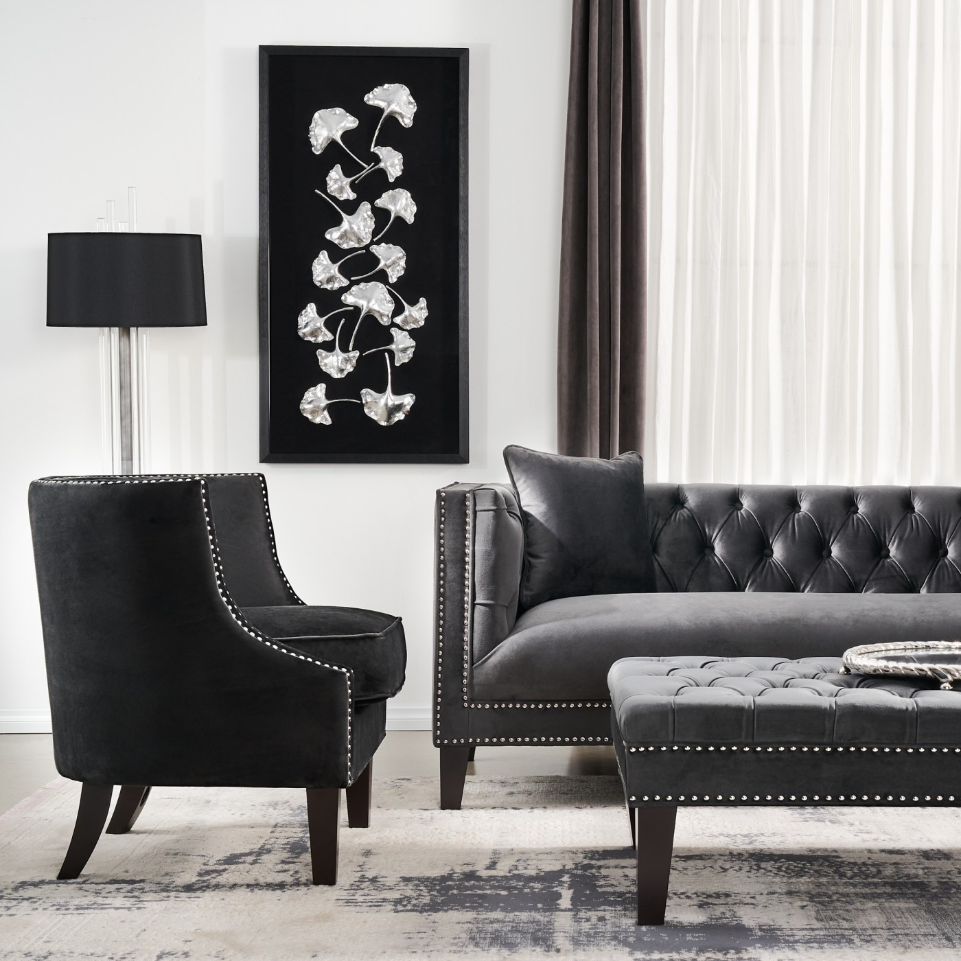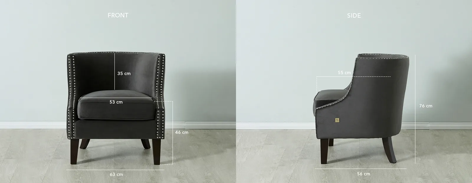 A very comfortable and impressive looking chair. The velvet fabric is gorgeous and the silver studs add a touch of sophistication.