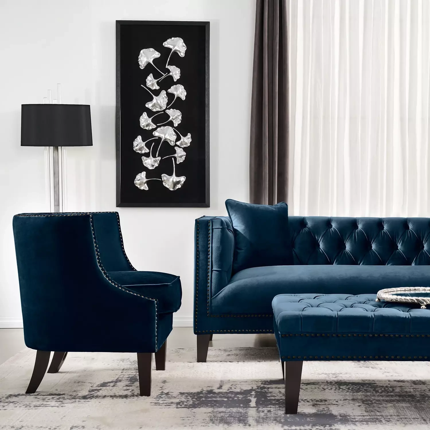 The Vogue Chair showcases luxurious navy-blue velvet upholstery that offers a chic look and a soft, inviting texture. Brass-coloured studs along the frame enhance its stylish appeal, making it a standout piece.