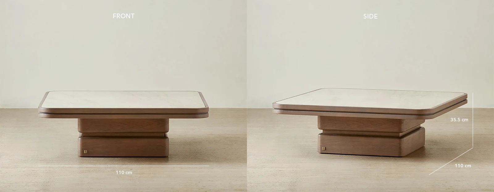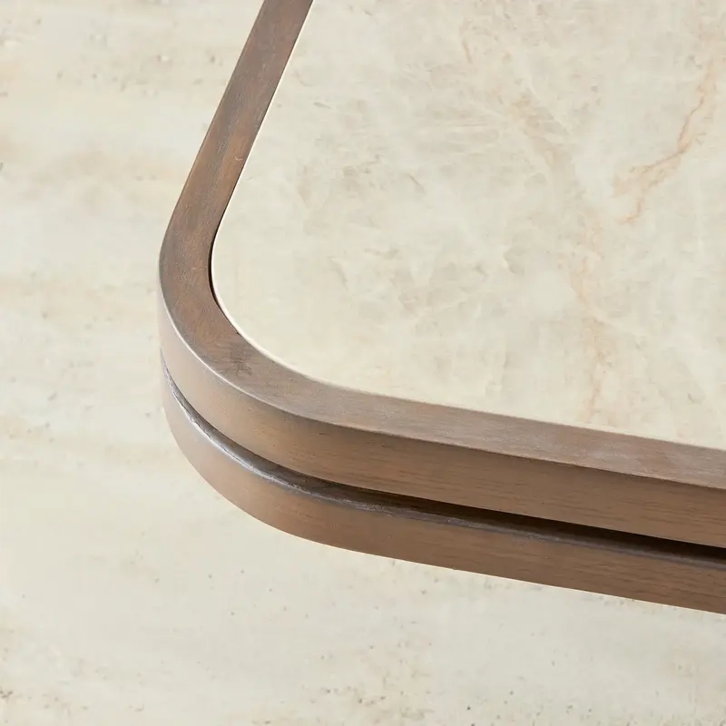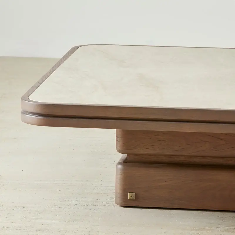 Crafted with a walnut brown wooden base and a Taj Mahal sintered stone top, the Whimsy Coffee Table combines strength and sophistication.