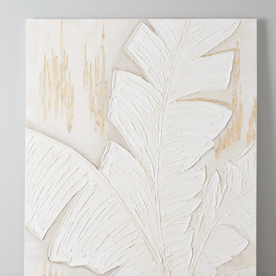 The white-on-white approach gives the painting a contemporary, minimalist vibe while emphasizing the organic shapes and details of the banana leaves. Accentuating this monochromatic beauty are dashes of gold in the background, which suggest a sense of luxury and splendor. The subtle inclusion of gold not only breaks the uniformity of the white but also adds a layer of warmth and richness to the painting.