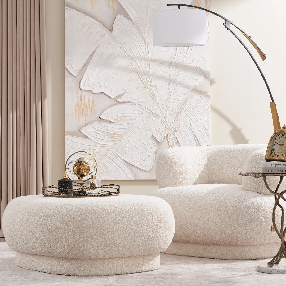 The banana leaf painting brings a sense of calm and natural elegance to the space. Its soft texture and subtle gold accents add depth and warmth, perfectly complementing the neutral tones and relaxed atmosphere of the room.