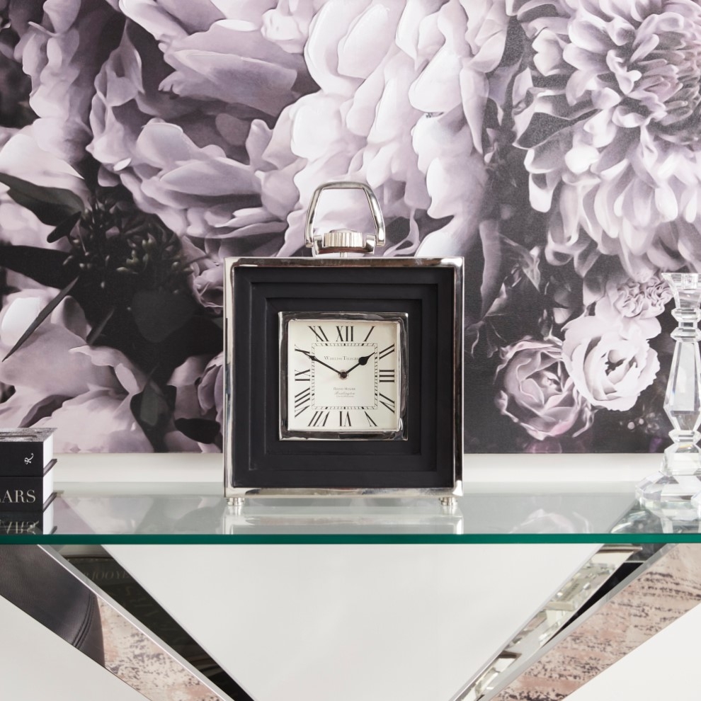The Williams table clock is a testament to timeless elegance, seamlessly melding vintage charm with sophisticated design elements. At its pinnacle, a stylish handle enhances its portability, while the intricate Nickel detailing and cascading black frames enrich its visual appeal.