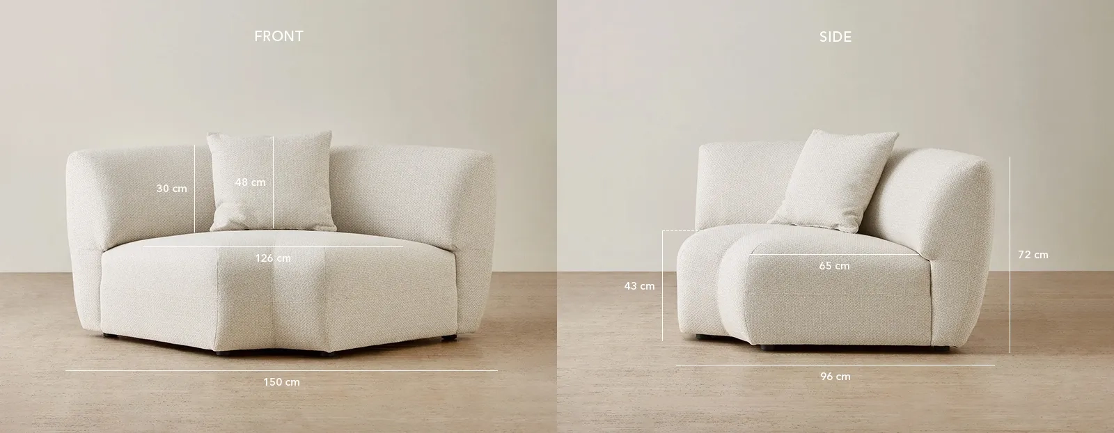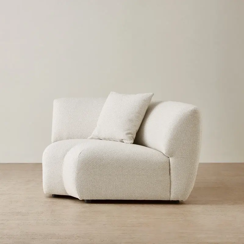 The Willow Modular Corner Seat is upholstered in an ivory beige woven fabric that offers a refined texture and a soft, natural tone. Its rounded back and deep seat create a sculptural silhouette.
