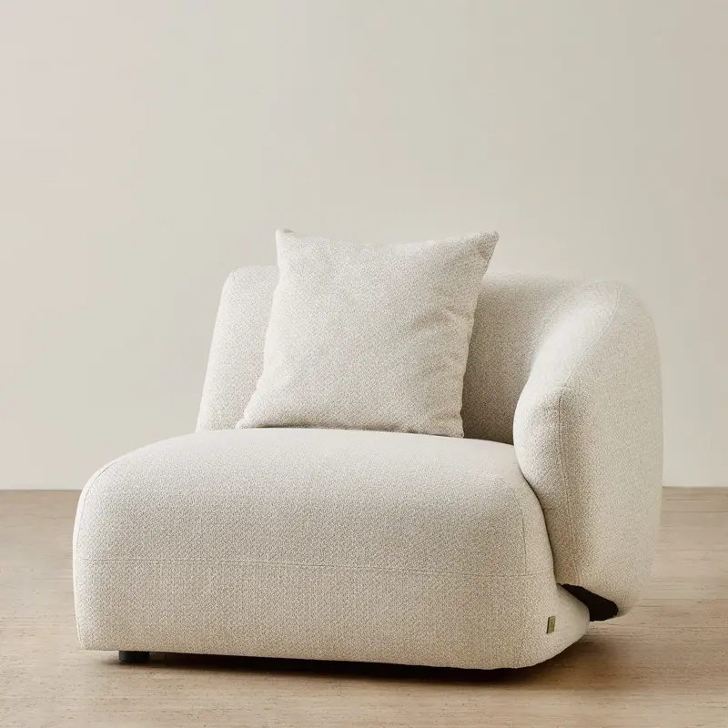 The Willow Modular Right Arm Seat is upholstered in an ivory beige woven fabric that offers a refined texture and a soft, natural tone. Its deep seat and gently contoured form create a relaxed, sculptural silhouette that enhances any space.
