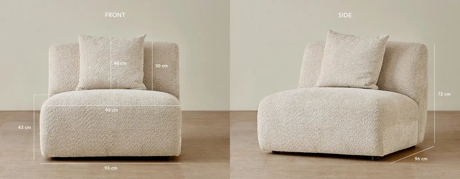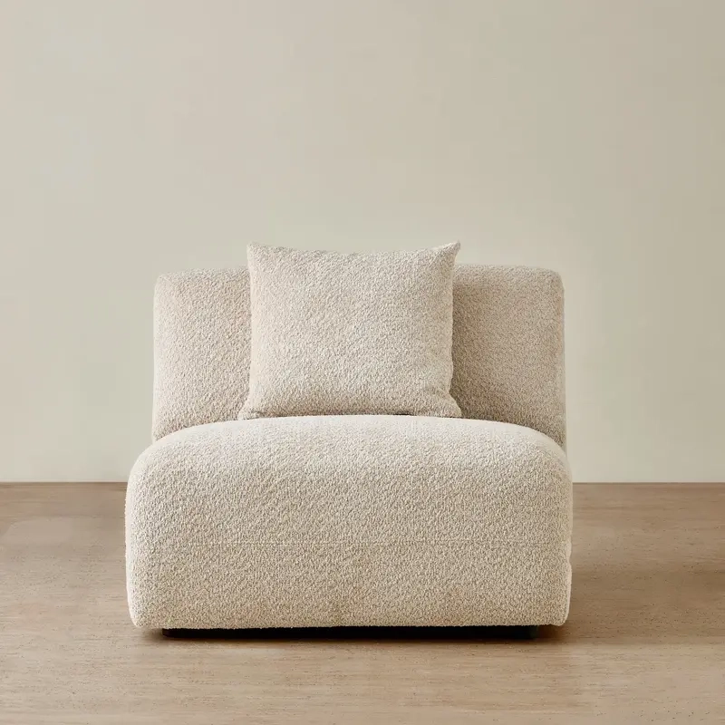 The Willow Modular Armless Seat is upholstered in a mid beige woven fabric that offers a rich, tactile texture and a warm, timeless tone. Its deep seat and gently contoured form create a relaxed, sculptural silhouette that suits both classic and contemporary interiors.