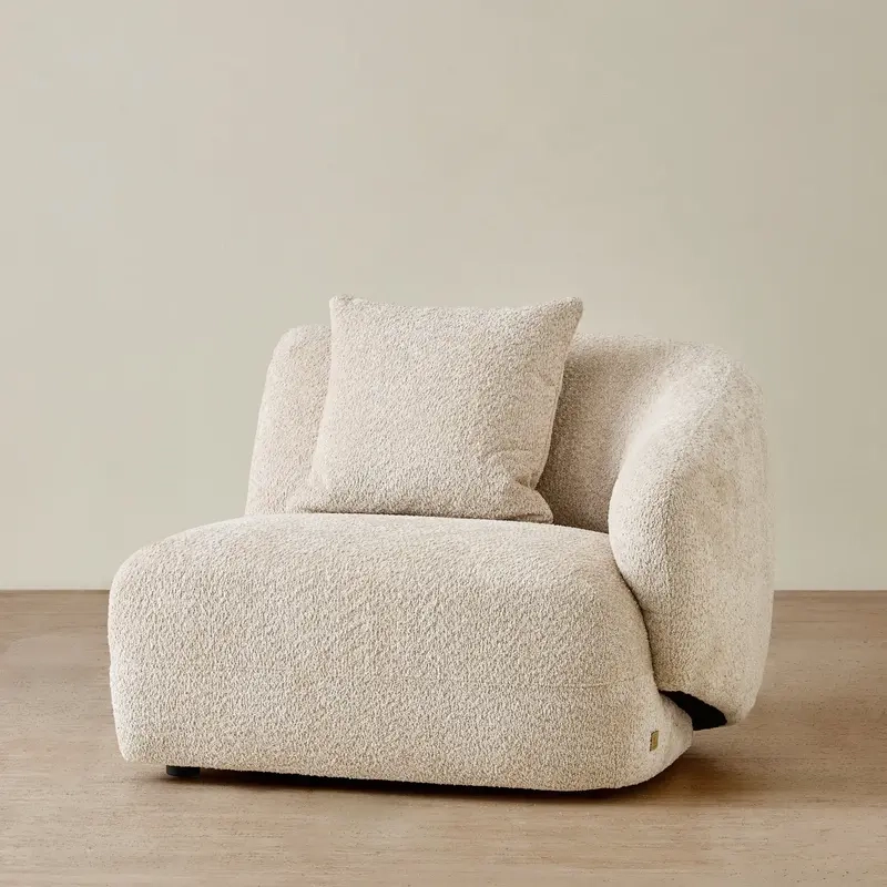 The Willow Modular Right Arm Seat is upholstered in a mid beige woven fabric that offers a rich, tactile texture and a warm, timeless appeal. Its deep seat and gently contoured form create a relaxed, sculptural silhouette that complements any interior.