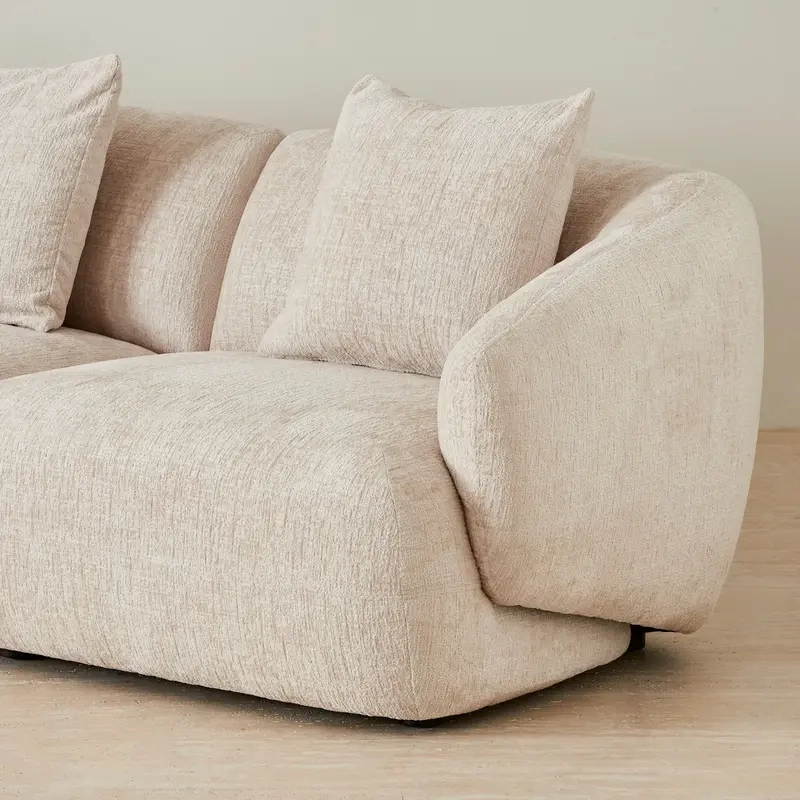 The Willow 3 Pieces Modular Sofa is upholstered in a powder white chenille fabric that offers a smooth, inviting texture with a subtle sheen. The deep seats and gently contoured form create a relaxed, sculptural silhouette.