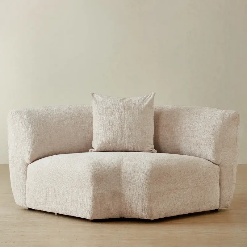 The Willow Modular Corner Seat is upholstered in a powder white chenille fabric that offers a smooth, inviting texture with a subtle sheen. Its rounded back and deep seat form a sculptural silhouette.