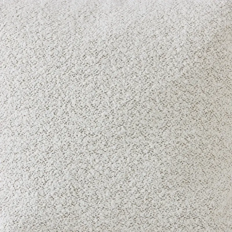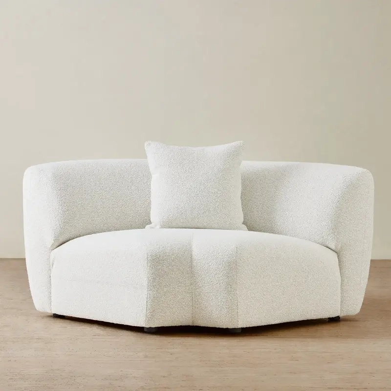 The Willow Modular Corner Seat is upholstered in a stone white woven fabric that offers a refined texture and a clean, contemporary look. Its rounded back and deep seat create a sculptural form.