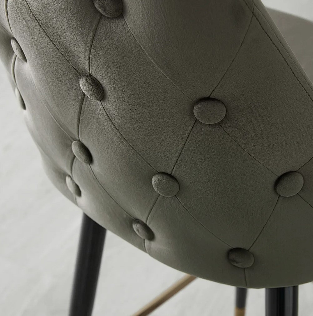 Charming button tufts decorate the Winston Bar Stools backrest, which gives the seat the sophisticated Hamptons aesthetic. Four legs seamlessly flow from the base and are tipped with golden metal frames. These legs are joined by a metal connector that functions as a footrest to help you relax as you enjoy drinks and conversations. The Winston Barstool looks best in pairs, along with one of our gorgeous bar tables for a truly sophisticated home bar setup.