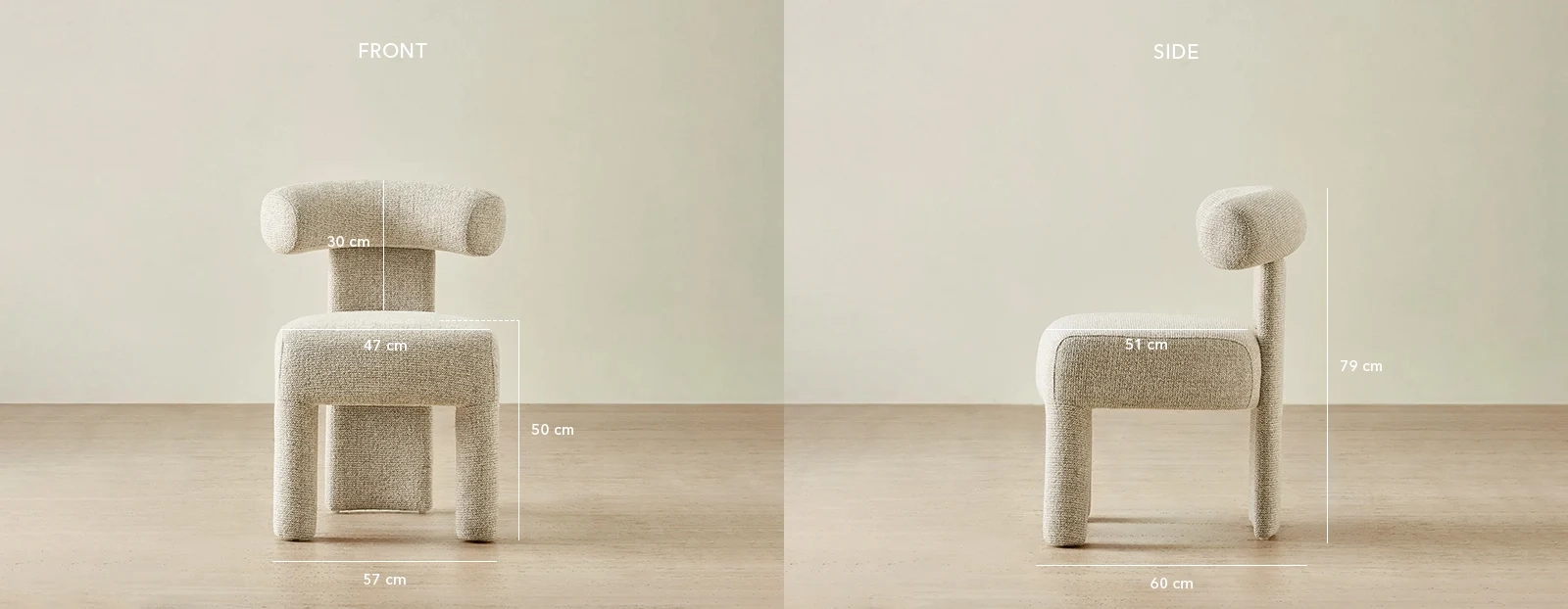 The Wisteria Dining Chair is cloaked in a warm and inviting stone white fabric. Its curved backrest gently wraps around you, offering a sense of comfort.