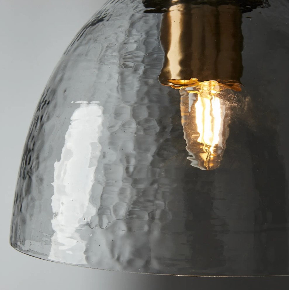 Adding to its distinctive charm is the bulb, ensconced within a mesmerizing hammered glass cover. This textured glass is an artisan's touch, allowing the light to scatter uniquely, turning a singular glow into a captivating dance of luminous reflections.