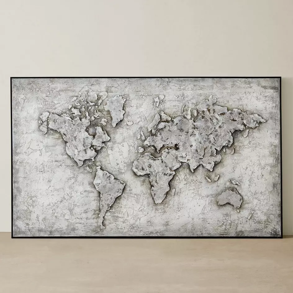 The World Map Painting is not just a geographical representation; it's a striking piece of art that brings a global sensibility into any room. This particular painting takes the familiar form of the world's continents and infuses it with a rich, tactile quality through the use of elevations and depressions, creating a three-dimensional effect on the canvas.