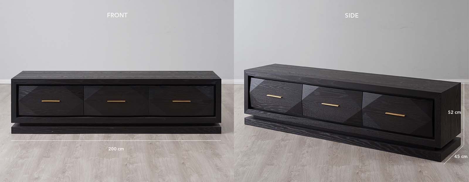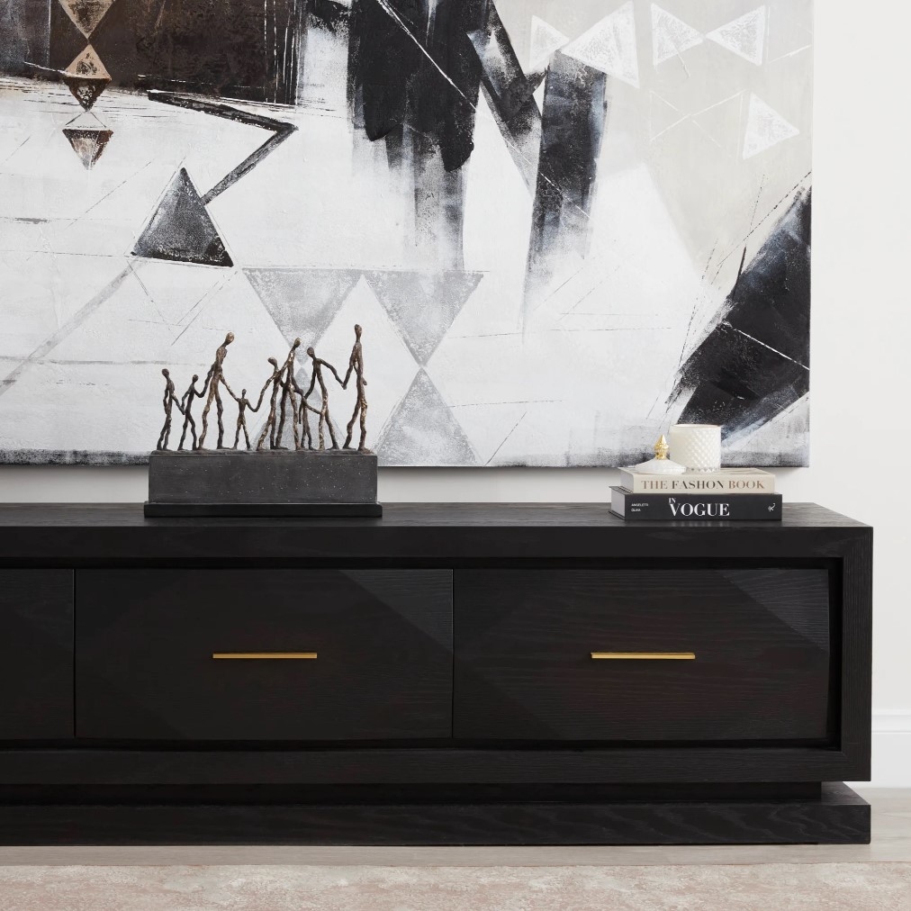 The Xandra Black Oak Veneer Entertainment Unit is a versatile and stylish piece crafted to highlight your gorgeous decorations and appliances. It features luxurious black and gold colours that are sure to complement a variety of interior decor themes. Premium Black Oak Veneer decorates the Xandra Entertainment Unit's exterior with a luxurious dark lustre. Standing out are the Xandra Dining Cabinet's minimalistic handles that shine in glints of gold.