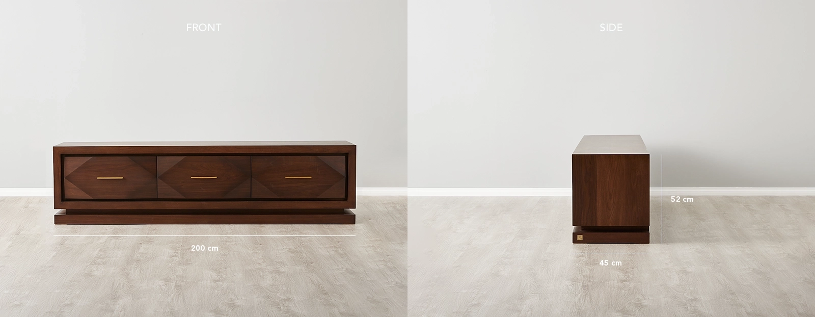 Display your prized media players and appliances as the Xandra's top section offers enough room for TVs, Record Players and Speakers. Stay organized as you store wires, microphones and more in the Xandra's three spacious pull-out drawers. Pair the Xandra Dark Walnut Veneer Entertainment Unit with one of our majestic sofas for a truly luxurious living room. The Xandra Dark Walnut Veneer Entertainment Unit also comes in a Black Oak coloured variant.