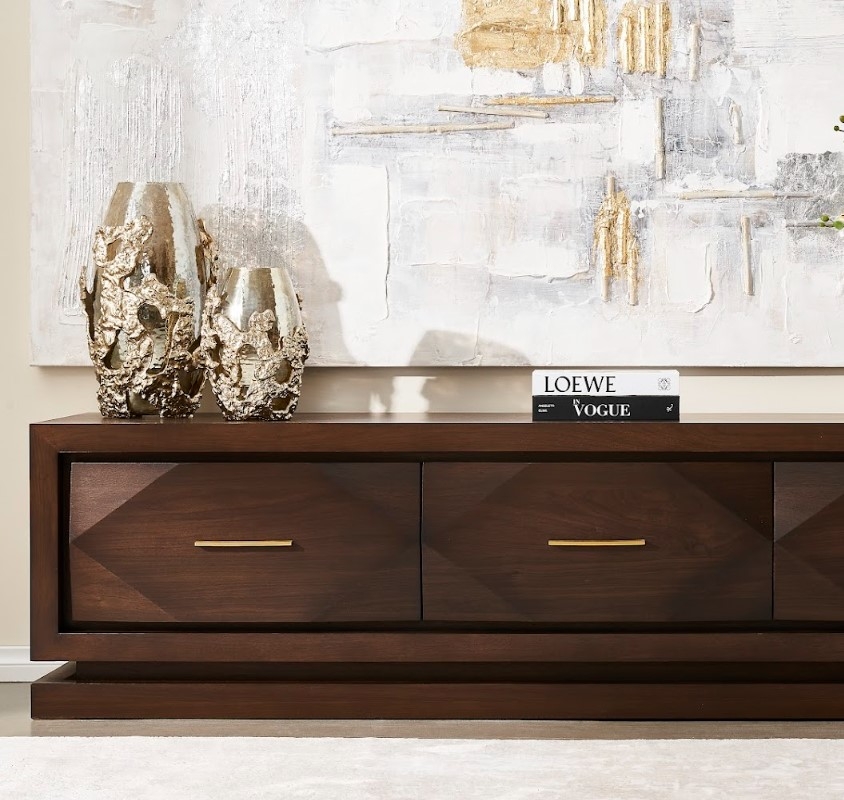 The Xandra Dark Walnut Veneer Entertainment Unit is a versatile and stylish piece crafted to highlight your gorgeous decorations and appliances. It features rustic colours that are sure to complement a variety of interior decor themes. Premium Dark Walnut coloured Veneer decorates the Xandra Entertainment Unit's exterior with warm brown hues. Standing out are the Xandra Dining Cabinet's minimalistic handles that shine in brass colours.